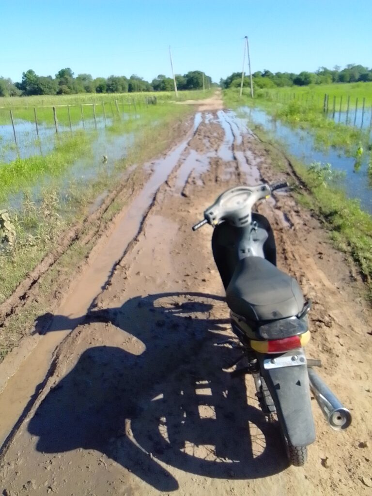 Hubo lugares a los que no pude llegar porque el finde anterior había llovido bastante y había caminos cortados, llenos de barro aún. Hay casas que todavía hoy están aisladas porque el agua se quedó estancada. Quienes tienen experiencia en moto y osadía se animan a cruzar. Hay quienes se caen al intentarlo y hay quienes no. Hay quienes dudamos, reflexionamos y decidimos tomar otro camino, diferente del planeado. Eso me permitió ir a casas a las que no pensaba ir o estar más tiempo en las que pensaba estar menos. Pude visitar a Beti, que me compartió que a su hija le había costado mucho este primer año de secundaria y no sabe cómo ayudarla. Pude visitar a Marta, que estaba con su hijo menor y sus tres nietos que hoy tiene a cargo, quedarme charlando más tiempo del que pensaba, aceptar su invitación a comer unas riquísimas marineras -de hígado- con puré.