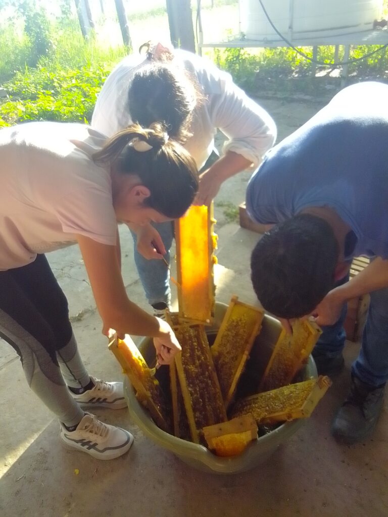 También en Boquerón, hubo otra cosecha de miel. En una calurosa -muy calurosa- tarde de lunes, ayudé a llevar los cajones desde el campo donde está el apiario hasta el centro comunitario. Ahí sacaron el producto de unos 6 cajones, que luego colaron. Un poco más de 26 kilos de una miel oscura, cuyo color se debe a la floración de la que se alimentaron en este tiempo las abejas: el quebracho colorado. Pasadas las dos horas, habíamos terminado. En general, es un proceso que conviene hacer a la mañana o a la noche. Esta vez lo hicimos a la tarde y eso llamó la atención de muchas abejas vecinas, que invadieron el lugar, atraídas por la miel. Con los trajes puestos y a gran velocidad, llevamos de regreso los cajones al apiario.